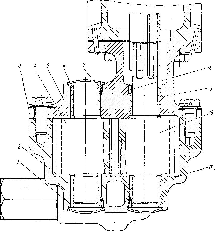 / — заглушка; 2, 6, 9, // — бронзовые втулки; 3 — чугунный корпус насоса; 4 — шестерня ведомая; Л —чугунная крышка корпуса; 7 и 8 — винты крепления втулок; 10— ведущая шестерня