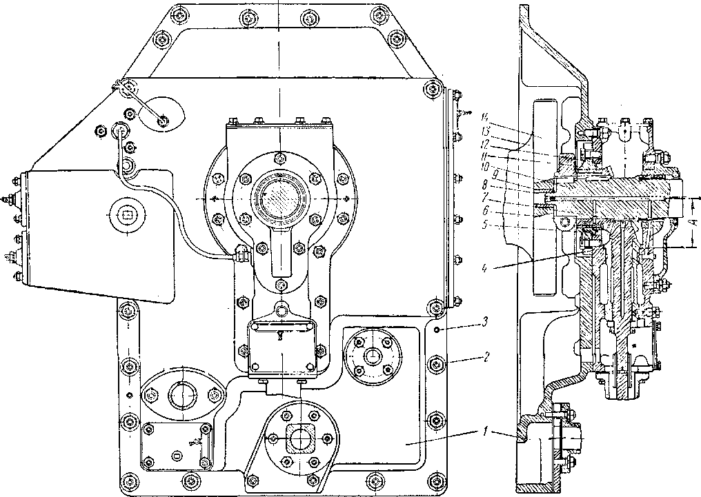 / — корпус; 2 —шпилька крепления корпуса; 3 —контрольный (конический) штифт; 4 — кольцевые прокладки; 5 — малая шестерня; 6 — большая шестерня; 7 — прокладки; 8 — хвостовик горизонтального вала привода; 9 — временная центрирующая втулка; 10 — вал привода; // — внутренний фланец с бронзовым подшипником; 12 — прокладки для регулирования осевого зазора вала привода; 13 — коленчатый вал; 14 — поворотный диск