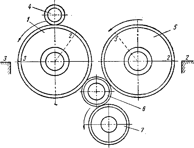 /—шестерня вала привода топливного насоса; 2, 2, 2 и 3, 3. 3 — монтажные метки; 4 — шестерня привода водяного иасоса; 5 — шестерня распределительного вала клапанов; 6—паразитная шестерня; 7— ведущая шестерня коленчатого вала