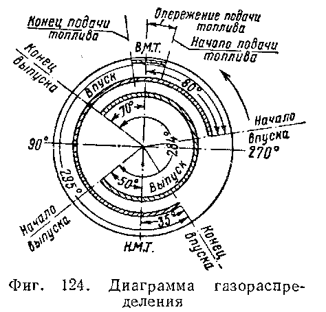 Проверку углов открытия и закрытия впускных и выпускных клапанов в эксплуатации производят следующим образом. Устанавливают градуированный диск, как было описано выше. Для удобства отсчётов его нулевое деление должно соответствовать в. м. т. поршня проверяемого цилиндра. Далее проворачивают коленчатый вал по ходу двигателя до положения, при котором штангу выпускных клапанов можно будет проворачивать. вокруг оси рукой только с трудом. При этом определяют угол, на который провернулся градуированный диск. Этот угол будет соответствовать углу начала открытия выпускного клапана и должен быть равен 50 ±10° до н. м. т. (фиг. 124). Продолжая вращать коленчатый вал, устанавливают его в положение, при котором ролик рычага толкателя начнёт сбегать с кулачка распределительного вала и штангу можно будет проворачивать рукой. Это по-