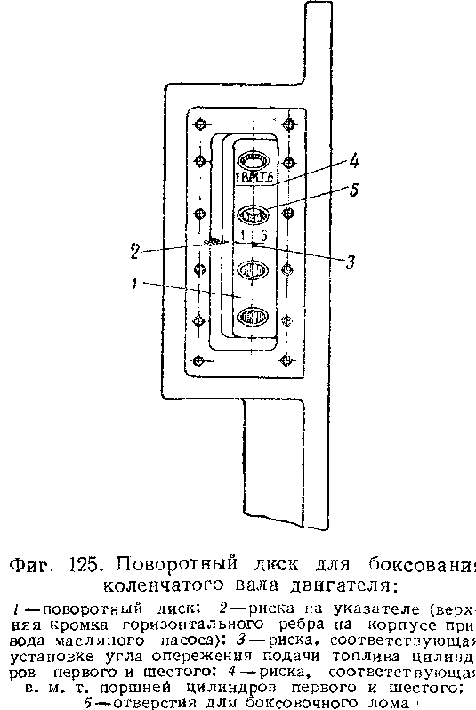 При невозможности установить градуированный диск на горизонтальном валу привода масляного насоса или компрессора можно приближённо пользоваться делениями и цифрами, нанесёнными на ободе поворотного диска, где выбиты отметки, соответствующие в. м. т. поршней каждого цилиндра. Указателем в этом случае служит горизонтальное ребро (прилив) в корпусе привода с левой стороны около боксовочного лючка. Кроме того, определение в. м. т. может быть произведено индикатором до постановки крышки цилиндра или после постановки её через отверстие для форсунки.