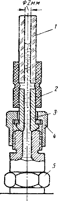 1 —стеклянная трубка; 2 — резиновая трубка; 3 — наконечник нагнетательной трубки; 4 — накидная гайка; 5 — штуцер