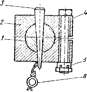 Регляж представляет собой простое приспособление, состоящее из корпуса 1 (фиг. 121), в средней части которого имеется отверстие с выточкой 2. Внутри корпуса 1 установлен стержень 4 с буртом 3, необходимым для ограничения движения стержня вниз. В верхнюю плоскость буртика упирается пружина 5, зажатая сверху гайкой 6.
