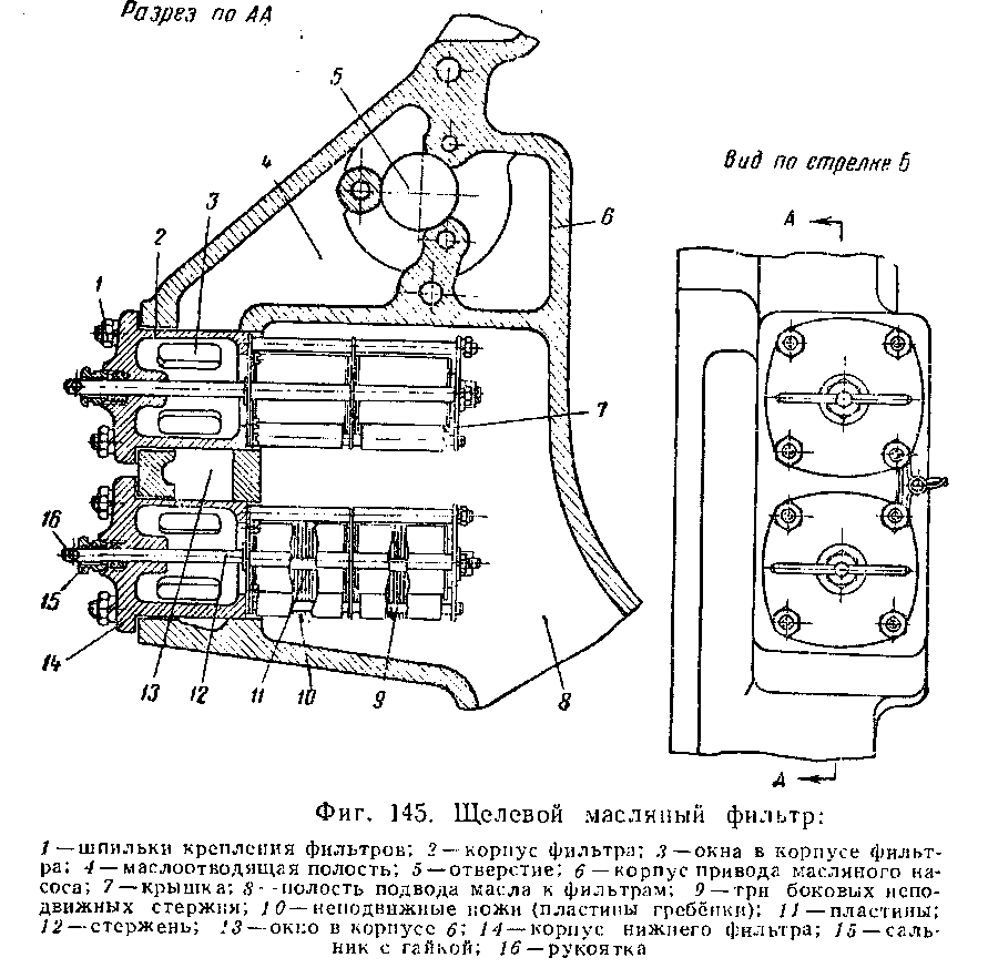 Щелевой масляный фильтр (фиг. 145) фактически состоит из двух фильтров, смонтированных в корпусе 6 привода масляного насоса и конструктивно близких щелевым топливным фильтрам. Каждый фильтр состоит из набора пластин 11, насаженных на стержни 12. По бокам пластин установлены стержни 9, на которые насажены неподвижные ножи 10. Ножи входят в зазоры, равные 0,15 мм между пластинами //. Снизу пластины закрыты крышками 7 и затянуты гайками. Стержни фильтров установлены в отдельные корпуса 2, где они уплотнены сальниками. Фильтры крепятся в корпусе привода 6 шпильками 1.
