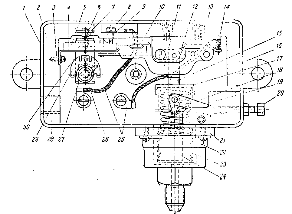 / — .латунная коробка; 2 — панель; 3 —впиты; 4 — пружинящая пластина магнита; 5 —постоянный магнит; 6 — штифт; 7 —винт; 8 — ограничитель хода; 9 — неподвижный контакт; 10— пружинящая пластина подвижного контакта; //—рычаг; 12 — текстолитовый сухарь; 1:) — обойма; 14 — пружина; 15 — тяга; 16 — пластина; 17 — изоляционная тарелка; /« — регулировочная пружина; 19 — вильчатый рычаг; 20 — регулировочный болт; 21 —усиливающая .планка; 22 — корпус датчика; 23 — гофрированная трубка; 24 — стержень; 25 — шунты; 26 — эксцентриковый валик; 27 — указатель; 28 — бойки; 29 — шкала; 30 — латунный корпус