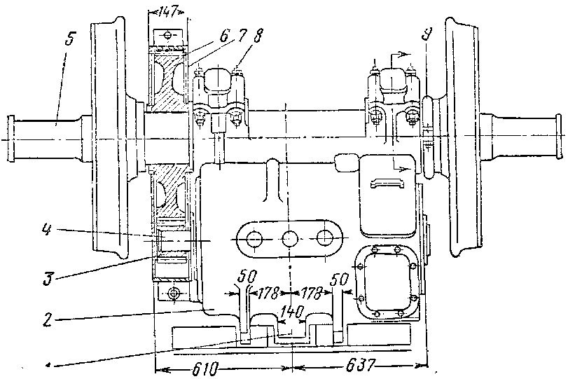 1—опорные кронштейны: 2— остов тягового электродвигателя: 3 — малая ведущая шестерня; 4 — вал якоря; 5 — колёсная пара; б— большая шестерня; 7— кожух; 8 — крышка моторно-осевого подшипника; 9 — уплотнительное кольцо