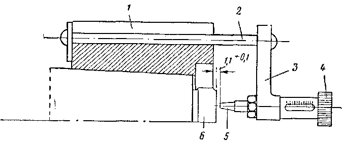 /—зубья шестерни: 2—стержэнь; 3— кронштейн; 4 — головка микрометрического винта; 5 — штифг; 6—торец вала якоря