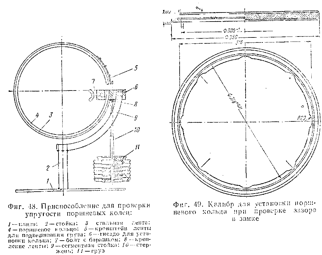 Компрессионные и маслосрезывающие кольца отлиты из модифицированного чугуна. Груз, подвешиваемый к стальной ленте прибора для определения упругости маслосрезывающих колец при рабочем зазоре в замке 1,8 мм, составляет 5,5—7,5 кг.