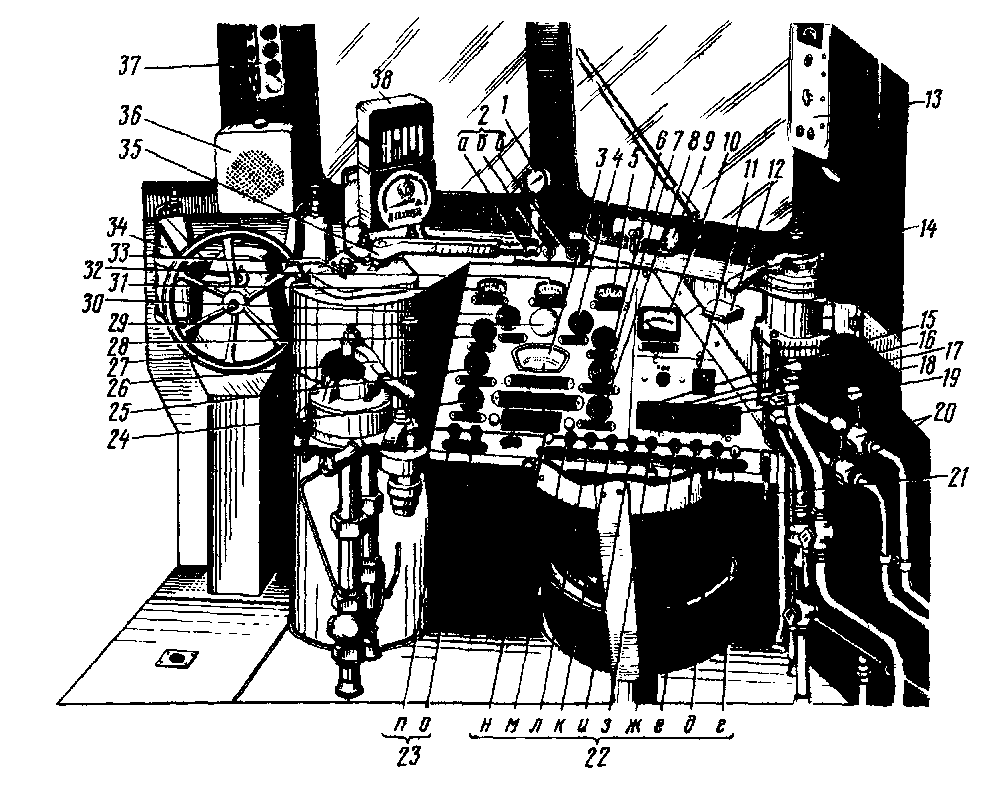 1 секции; 25— электротермометр, показvваіий температуру масла до холодильника I секции; 26 — ручка крана машиниста; 27 — штурвал ручного тормоза; 28 — манометр, показvваіий давление масла во II секции; 29 — светильник; 30 — электроманометр, показvваіий давление масла во II секции; 31 — вольтметр, показvваіий напряжение тягового генератора; 32 — амперметр тока нагрузки тягового генератора; 33 — ручка реверсора; 34 — огнетушитель; 35—рукоятка контроллера машиниста; 36 — динамик радиостанции; 37 — локомотивнvй светофор; 38 — скоростемер