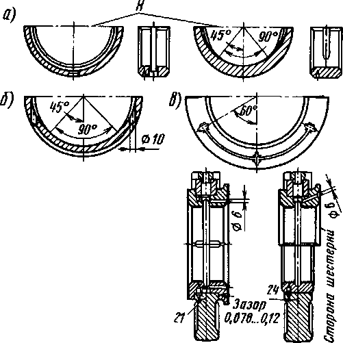 Рис. 42. Коренные вкладыши коленчатого вала: а — коренные вкладыши нижнего коленчатого вала (Я— плоскость разъема); б— коренные вкладыши верхнего коленчатого вала; в — изменение конструкции упорного вкладыша коренной опоры