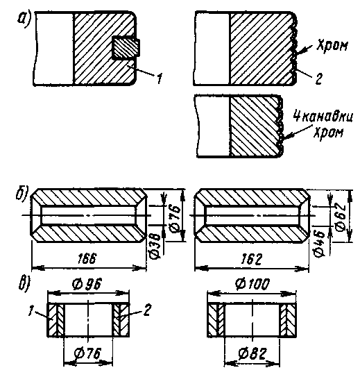 Срок службы по износу поршневого пальца, втулки верхней головки шатуна и унификация этих деталей для всех типов дизелей Д100 выше при установке плавающего поршневого пальца диаметром 82 мм с увеличенным диаметром расточки верхней головки шатуна с. диаметра 96 до 100 мм и соответствующим изменением втулки верхней головки шатуна (рис. 43, б, в).