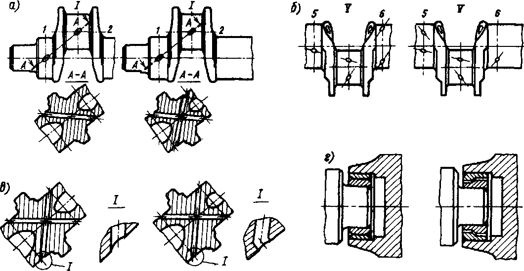 Рис. 44. Маслоподводящие каналы: а — точки подвода масла к вкладышам подшипников; б—направление потока масла к вкладышам 5-й и 6-й кореииых опоо, в — направление сверления 2, 3, 5 и 9-й опор нижнего и 2, 3, 4-й опор верхнего коленчатых валов, г— центрирующие кольца хвостовиков коленчатого вала и вала якоря генератора