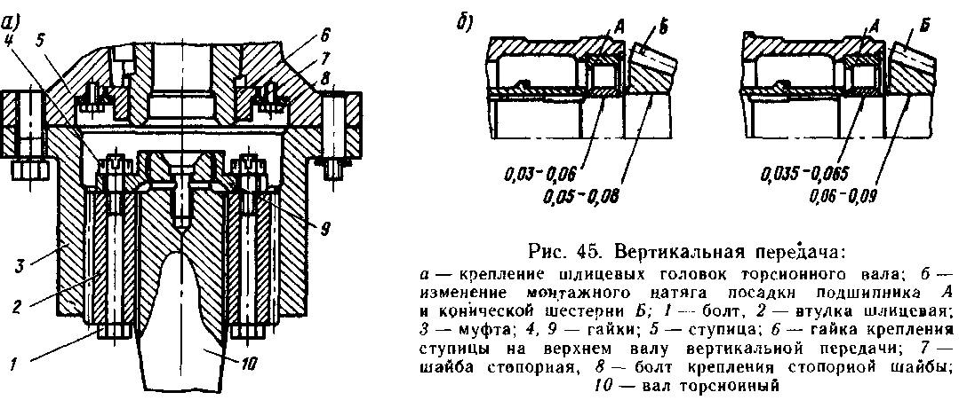 вала и шлицевой втулки. Торсионный вал удерживается в нижнем валу вертикальной передачи, а шлицевая втулка 2 (см. рис. 45, а) подвешена на торсионном валу 10 с помощью гайки 4 и болтов /.