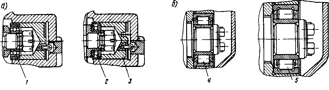 Рис 46. Подшипники масляного насоса а — упорный подшипник, б — опооный подшипник, / — шариковый радиальный подшипник 46205Л, 2 — упооиый шариковый подшипник 8206К, 3 — поршень узла упорного подшипника 4 — опооный оолвковый подшипник 32608, 5 — опорный роликовый подшипник 32608М