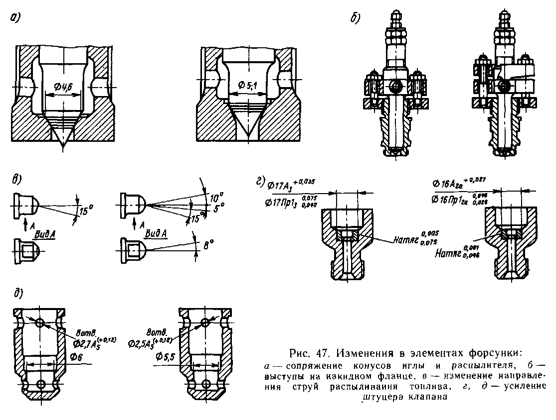Форсунка и топливный насос. Работа форсунки непосредственно влияет на рабочий процесс дизеля, а следовательно, на работоспособность поршневой группы, втулок цилиндров, тепловое состояние поршневой группы, а также на нагароотложения и разжижение масла топливом. Поэтому необходимо повышать качество распы-ливания топлива и обеспечивать стабильность и длительность его режима Изменением сопряжения конусов иглы и распылителя была повышена долговечность работы форсунки и стабильность распыливания топлива (рис. 47, а)