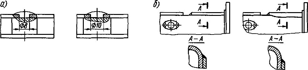 Рис. 48. Изменения в выпускном коллекторе' а — электрозаклепки, б — сварной шов