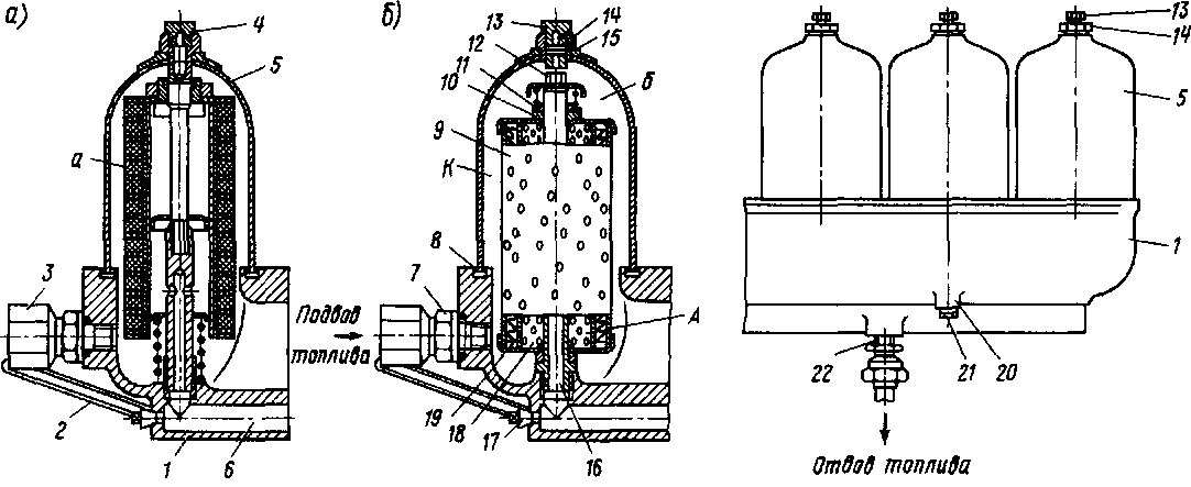 Рис 49. Бумажный фильтрующий элемент вместо войлочного: а — фильтр тонкой очистки с войлочным фильтрующим элементом, б — фильтр с бумажным фильтрующим элементом в том же корпусе, / — корпус, 2 — шплинтовка проволочная, 3 — защитный колпачок (при транспортировке), 4, 8, 15—прокладки, 5—колпак, 6—канал чистого топлива; 7—штуцер подвода топлива, 9 — четыре бумажных фильтрующих элемента (под каждым колпаком бумажный элемент), 10—нажимная втулка, // — пружина, 12, 14 — гайки, 13, 17—пробки, 16—стержень, 18 — сетчатая труба, 19 — шелковый чехол, предварительно надеваемый на сетчатую трубу, 20—бонка для слива отстоя, 21 — пробка для слива отстоя; 22 — штуцер отвода топлива, А — полость чистого топлива, К — полость грязного топлива
