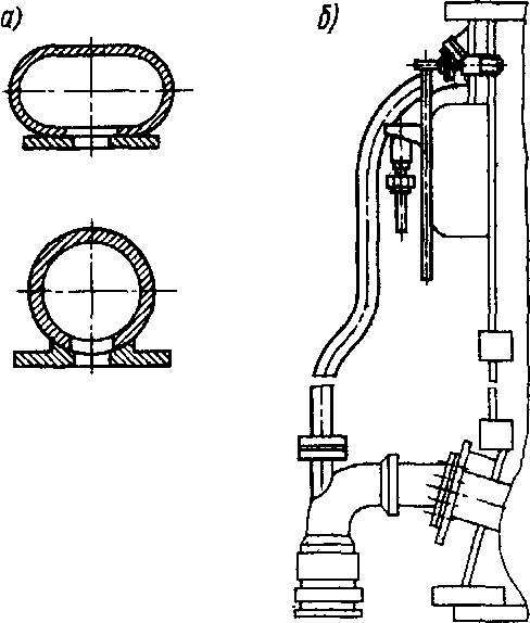 Рис. 50. Элементы масляной системы: а — изменено овальное сечение нижнего масляного коллектора на круглое; б — внешнее обводйое соединение нижнего и верхнего масляных коллекторов со стороны подвода масла в дизель