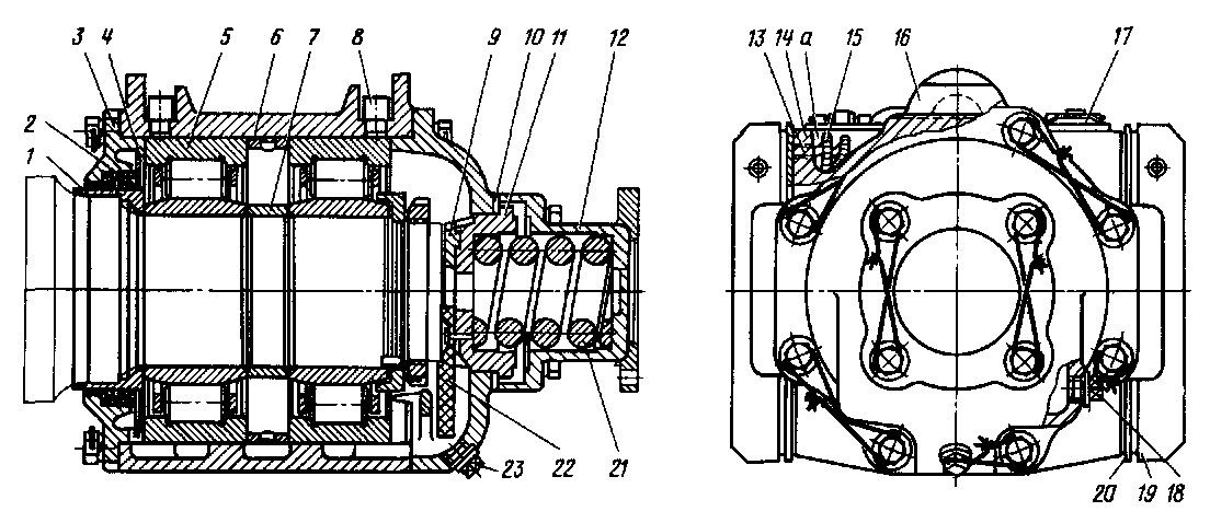 Рис. 105. Роликовая букса с упругим упооом: / — кольцо; 2 — севанитовое уплотнение; 3 — задняя коышка; 4 — распорное кольцо; 5 — роликоподшипник; 6,7 — дистанционные кольца; 8 — грибок; 9 — боонзовая наплавка; 10 — прокладка; / / — упор; 12 — корпус упора; 13 — трубка; 14 — корпус буксы; 15 — фитиль; 16 — арка; 17 — крышка; 18 — пообка; 19, 20 — наличники; 21 — пружина; 22 — фнтнль; 23 —.пробка