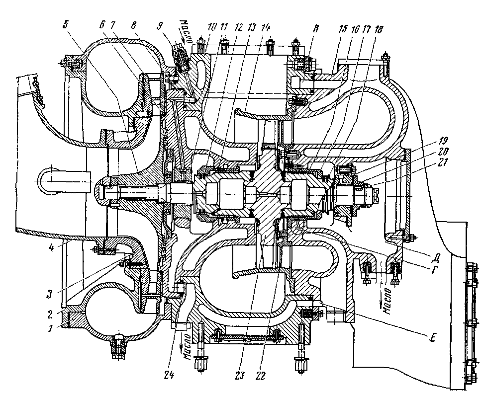 / — улитка воздушная; 2, 3 — проставки улитки; 4 — входной патрубок компрессора; 5 — рабочее колесо компрессора; 6— резиновое уплотнительное кольцо диффузора; 7 — диффузор; 8 — проставок разьемный; 9— штуцер подвода масла; 10— корпус выпускной; И — подшипник опорный; 12, 18 — пружинные уплотнительные кольца (разрезные); 13, 16 — лабиринтные уплотнения ротора; 14 — кожух; 15 — улитка газовая; 17 — втулка лабиринтного уплотнения; 19 — подшипник опорно-упорный; 20 — упорная втулка ротора; 21 — гайка упругая; 22 — сопловой аппарат газовой турбины; 23 — ротор, 24 — уплотнение перетока масла; Е, В — каналы для перетока воды из корпуса в газовую улитку; Г — отверстие для подвода запорного воздуха к лабиринтному уплотнению; Д — полость для слива масла из подшипника