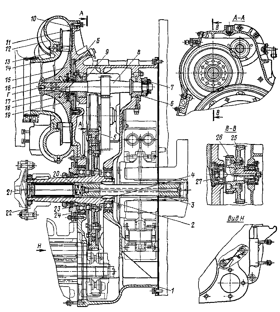 Редуктор с приводным нагнетателем. Двухступенчатый редуктор (рис. 27) с передаточным отношением 9,8 : 1 передает вращение от коленчатого вала ротору приводного нагнетателя, выполненному заодно целое с ведомой шестерней редуктора. На номинальной мощности дизеля при частоте вращения коленчатого вала 750 об/мин ротор нагнетателя вращается с п = 7350 об/мин.