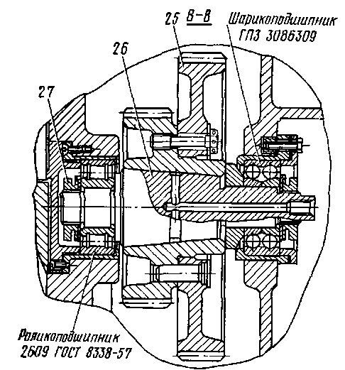Рис. 29. Новая конструкция подшипниковых узлов блока промежуточных шестерен редуктора (обозначения см. на рис 27)