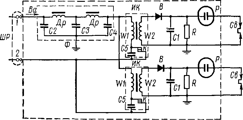 ШР — штепсельный разъем; Ф — фильтр; Др — дроссель фильтра; С2, СЗ, С4 — конденсаторы фильтра; ИК— индукционная катушка; Ц72 — первичная и вто-