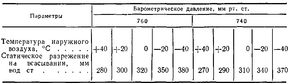 Во время реостатных испытаний после постройки тепловоза, а также после ремонта в депо и на заводе статическое разрежение на входе в патрубок турбокомпрессора при нормальных атмосферных условиях и номинальном режиме дизеля должно быть не более 300 мм вод. ст. придавлений наддувочного воздуха (избыточном) 1,1 кгс/сма. При других атмосферных условиях величина статического разрежения должна быть в пределах, указанных в табл. 8.