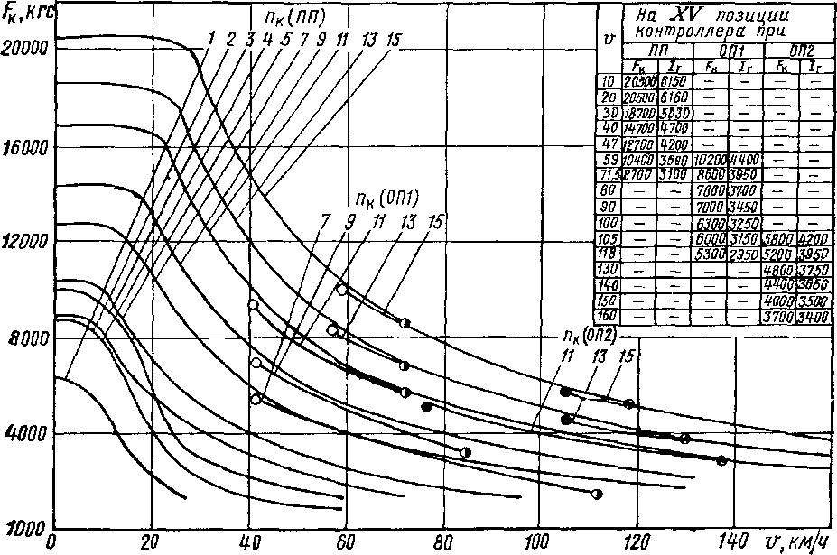 тере изменения касательной силы тяги тепловоза в зависимости от скорости движения, положения контроллера и режимов работы электродвигателей. Из рис. 4 видно, что касательная сила тяги тепловоза, соответствующая длительному току тяговых электродвигателей (700А), равна 12 700 при скорости движения 47 км/ч.