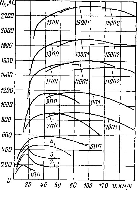 На рис. 5 представлена зависимость касательной мощности от скорости движения для различных позиций контроллера; из нее следует, что наибольшая касательная мощность при работе дизель-генераторной установки на XV позиции контроллера составляет 2330 л. с, или 77,6% мощности дизеля. По данным испытаний тепловоза № 0020, максимальная мощность на XV позиции контроллера была полечена 2450 л. с, что составляет 81,8% мощности дизеля. На рис. 6 представлена зависимость общего к. п. д. тепловоза от скорости движения. К. п. д. тепловоза при работе на XV позиции контроллера достигает 28,8%.