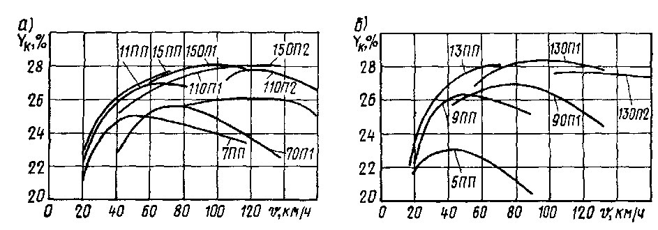Рис. 6. Зависимость общего к. п. д. тепловоза от скорости; а —Пк = 15, 11, 7; б —для позиции Пк-13, 9, 5