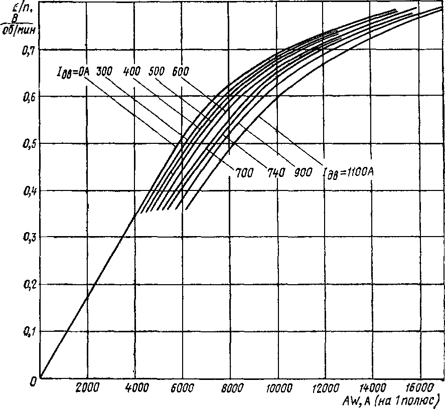 Катушки всех четырех полюсов соединены последовательно. Общее сопротивление обмотки главных полюсов при температуре 20° С составляет 0,0105 Ом. Зазор между центром полюсного башмака и якорем 7 мм, под краем башмака воздушный зазор 18 мм.
