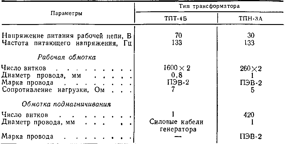 Между ярмом и сердечником имеется воздушный зазор, который можно регулировать немагнитными прокладками. Площадь поперечного сечения сердечника 45 см2. На стержни сердечника надеты две катушки с первичной и вторичной обмотками трансформатора. Данные обмотки трансформатора приведены в табл. 21.