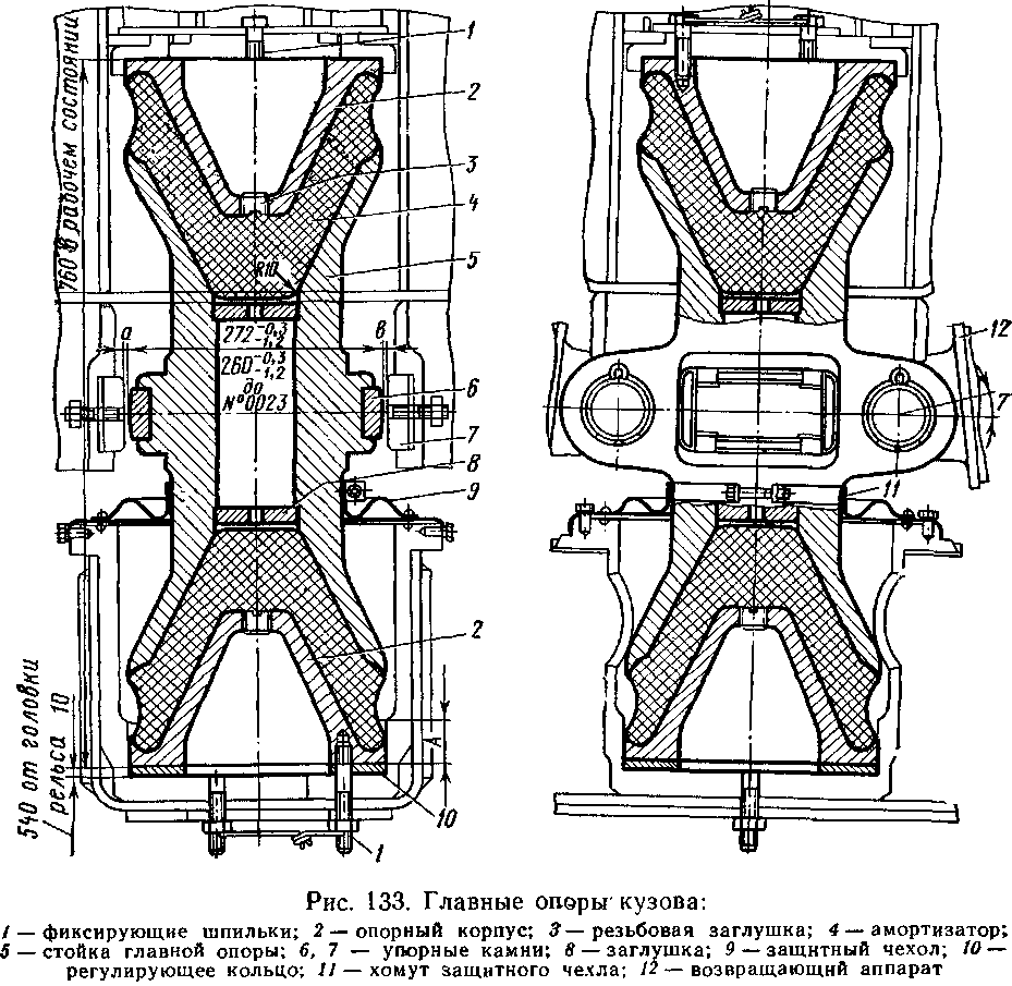 Возвращающий аппарат главных опор кузова. При прохождении кривых, а также отдельных горизонтальных неровностей пути главные опоры кузова отклоняются в ту или другую сторону на различные величины, зависящие главным образом от скорости движения и радиуса кривой пути.