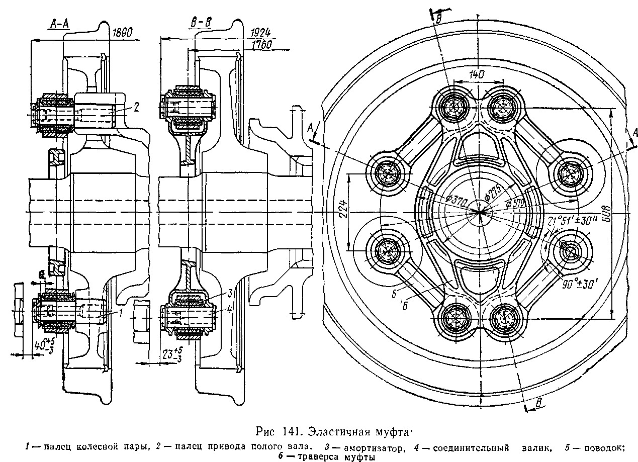 Вращающий момент от тягового электродвигателя к колесной паре тепловоза передает эластичная муфта (рис. 141). Она состоит из траверсы 6, поводков 5, амортизаторов 3, соединительных валиков 4 и деталей крепления.
