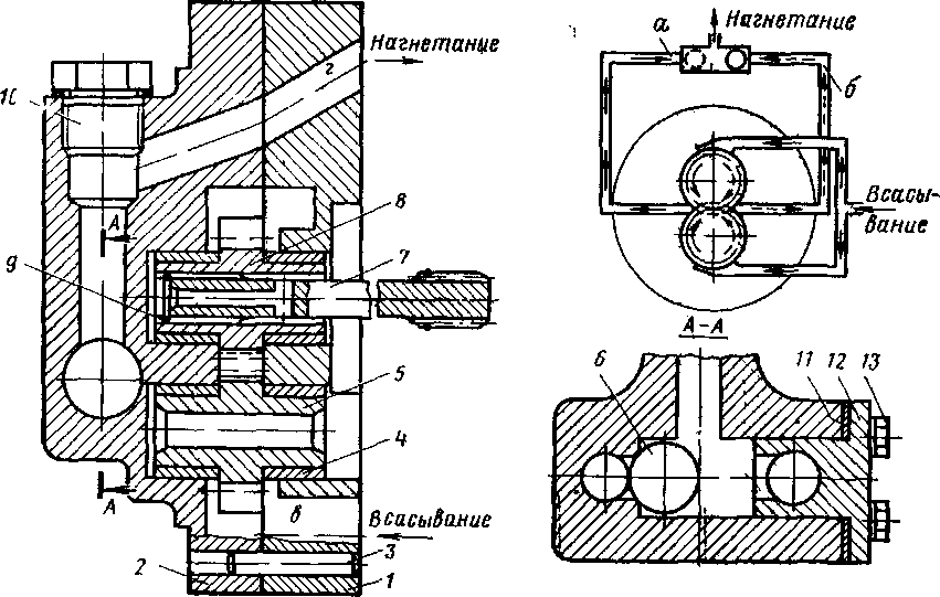 Шестерни 5 и 8 насоса вращаются в бронзовых втулках 4, запрессованных в корпус 2 и крышку /. Крышка / поставлена на штифтах 3 и прикреплена к корпусу двумя шпильками. Ведущая шестерня 8 насоса получает вращение от раздаточного вала гидропередачи через шестерни привода насоса и торсионный валик 7. Насос всасывает масло из картера выходного редуктора через фильтр по трубе в и кольцевой канавке в корпусе. Из насоса масло идет на смазку по трубе г. В зависимости от направления вращения ведущей шестерни масло нагнетается по трубе а или б. Перепуск масла из полости а в полость б и наоборот предотвращается шариком 6.