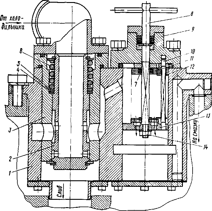 нагнетания превысит 5 кгс/см2, то клапан 16 переместится влево и сообщит канал нагнетания с каналом всасывания.