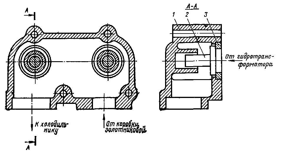 Обратные клапаны. На выходе масла из гидротрансформаторов установлены обратные клапаны (рис. 61), которые при работе на одном гидротрансформаторе не пропускают масло из системы питания в неработающий гидротрансформатор. При работе на холостом ходу (гидротрансформаторы опорожненные) обратные клапаны исключают возможность попадания масла из системы питания в аппараты.