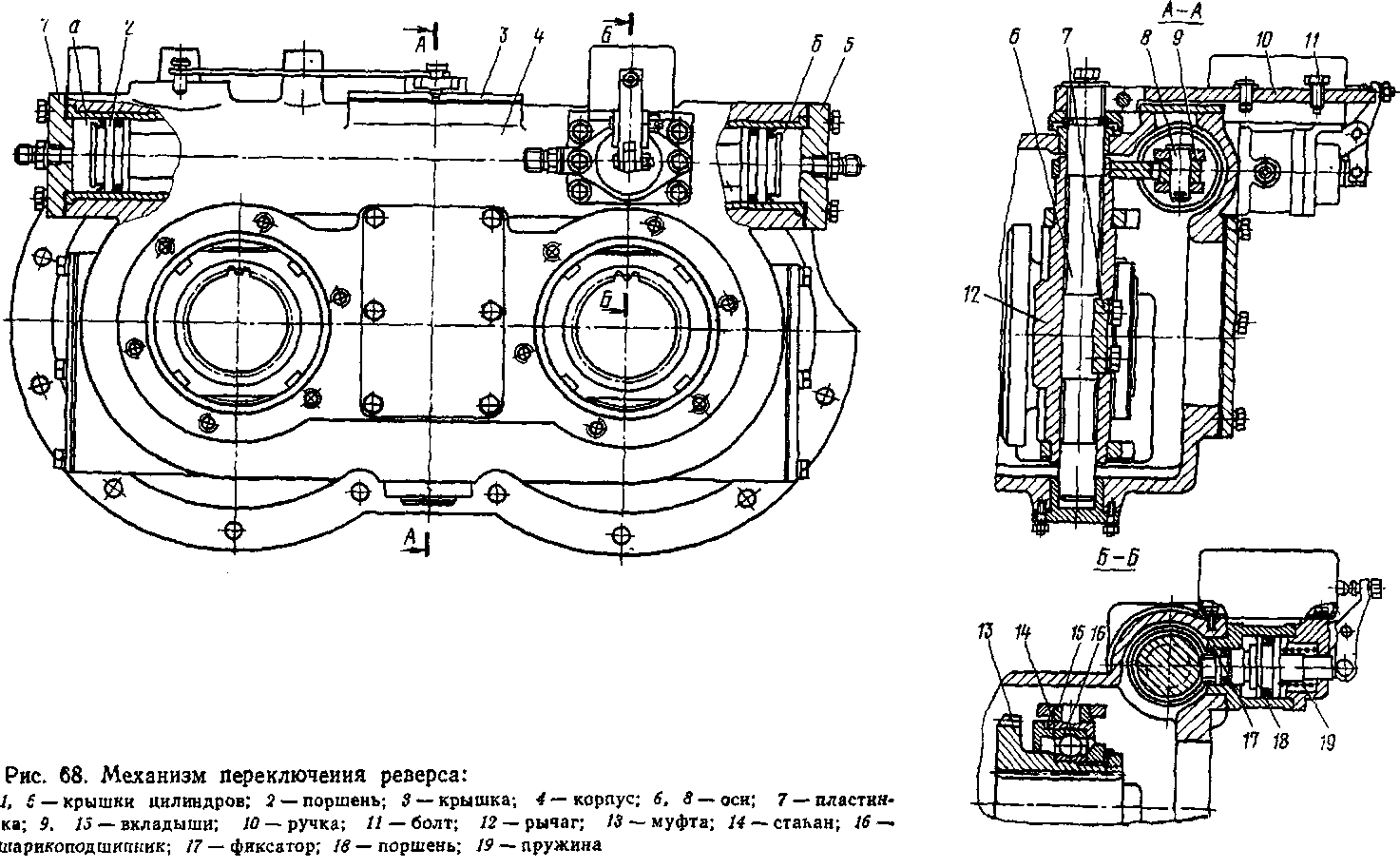 Поршень 2 соединен с рычагом 12 при помощи вкладыша 9 и оси 8. Соединение концов рычага 12 с каждой муфтой 13 (на рис. 68 это не показано) осуществляется при помощи двух вкладышей 15, стакана 14 и шарикоподшипника 16. Перемещение муфт реверса рычагом рассмотрено ниже.
