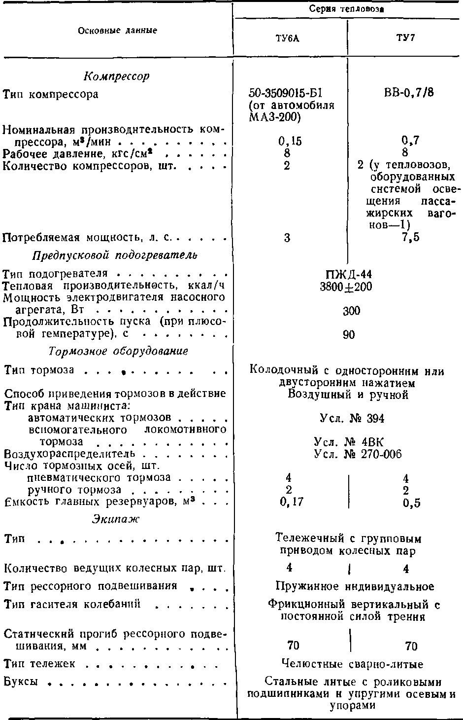 Основные технические данные тепловозов ТУ6А и ТУ7 приведены в табл. 1.