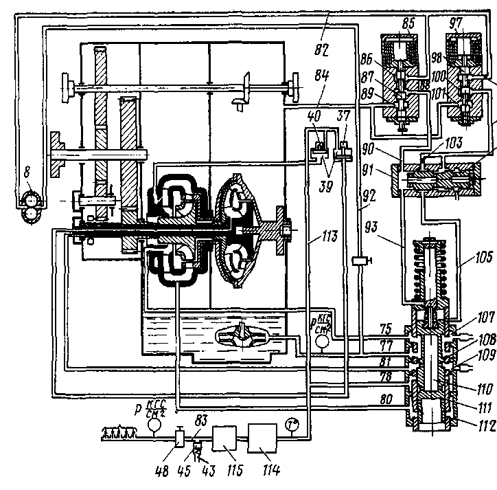« 4 — сервоцилиндр; 6, 7 — электропневматические вентили; 8 — питательный насос системы управления; 9 — шкиф; 10 — вал отбора мош-,1т ностн; //, 70 — входные валы; 12, 43, 75, 77, 78, 80—84, 90, 92. 93, 102, 105, 113 — трубопроводы и каналы линий всасывания, напора, слива и