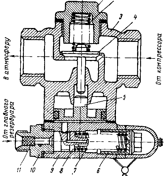 Воздух от компрессора через клапан 4 выходит в атмосферу до тех пор, пока давление в главных резервуарах упадет до 6,5—