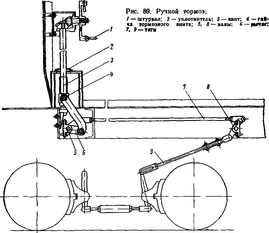 Для затормаживания тепловоза на длительных стоянках, когда нет воздуха в тормозной магистрали, предусмотрен ручной тормоз, с помощью которого прижимаются тормозные колодки одной (задней) тележки. Тормоз (рис. 89) крепится болтами к корпусу кабины. При вращении штурвала / по часовой стрелке через коническую передачу вращается винт 3, поднимая вверх