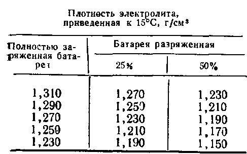Не реже одного раза в три месяца следить за полнотой заряда аккумуляторов по плотности электролита. При плотности электролита, соответствующей разряженности аккумуляторов более