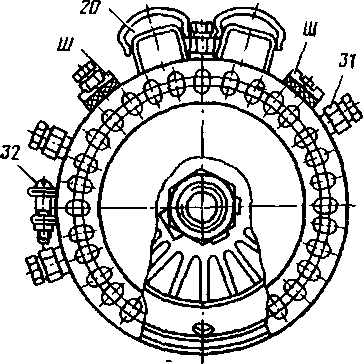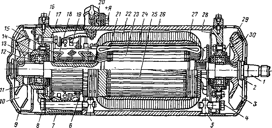 1 — вал якоря; 2 — гайка коелления вентилятора; 3. 10 — вентиляторы; 4, 8 — стягивающие болты; 5 — сухарь; 6 — траверса; 7 — защитная стальная леита; 9, 30 — кожуха вентилятора; 11, 29 — шариковые подшипники; 12 — сальник; 13, 14 — крышки сальника; 15 — изолирующая прокладка; 6, 31 — болты; 17, 28 — крышки; 18 — пластина коллектора; 19 — щетка; 20 — крышкз вывода; 21 — обмотка якоря; 22 — полюс с обмоткой возбуждения; 23 — катушка; 24 — винт; 25 — якорь; 26 — корпус; 27 — болт; 32 — стягивающий винт; + Я — положительный зажим; Ш — штепсельные разъемы обмотки возбуждения
