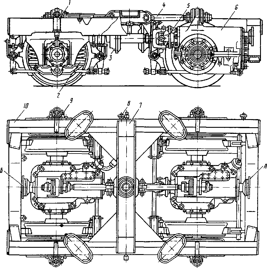 Тележка. Камбарокий машиностроительный завод разработал и освоил с 1974 г. серийное производство унифицированных тележек для тепловозов ТУ6А и ТУ7 (рис. 103). Эти тележки могут применяться для ранее выпущенных тепловозов ТУ4, ТУ5 и ТУ5Э Завод значительную часть изготовленных тележек поставляет заказчикам как запасные части. Тележка тепловоза двухосная. Она состоит из рамы 10, колесных пар с взаимозаменяемыми осевыми редукторами в, карданного вала 5, соединяющего осевые редукторы, рессорного подвешивания 2, тормозной системы, букс 9 п четырех гасителей колебаний 1. Тележка оборудована предохранительными скобами от падения осевых редукторов и карданных валов.