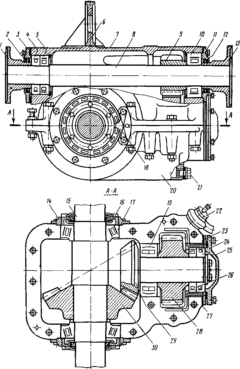 1, 13 — фланцы; 2, 12 — сальники; 3, 11, 14, 24 — крышки подшипников; 4, 5, 10, 17, 19, 25, 26 — подшипники; 6 — кронштейн реактивной тягн; 7 — крышка редуктора; 8 — вал; 9 — шестерня; 15 — ось колесной пары; 16 — корпус сальника; 18 — замок; 20 — картер редуктора; 21 — спускная пробка; 22 — заливная горловина; 23 — стакаи; 27 — прокладка; 28 — колесо: 29 — ведущая коническая шестерня; 30 — ведомое коническое колесо
