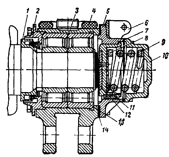 / — уплотнитель, 2 — крышки, 3 — корпус, 4 — резиновое кольцо, 5 — крышка буксы, 6 — ушко, 7, 14 — прокладкн, 8 — шайба регулировочная, 9 — пружина; 10— крышка осевого упора; // — стакан осевого упора, 12 — платнк; 13 — подшипнш