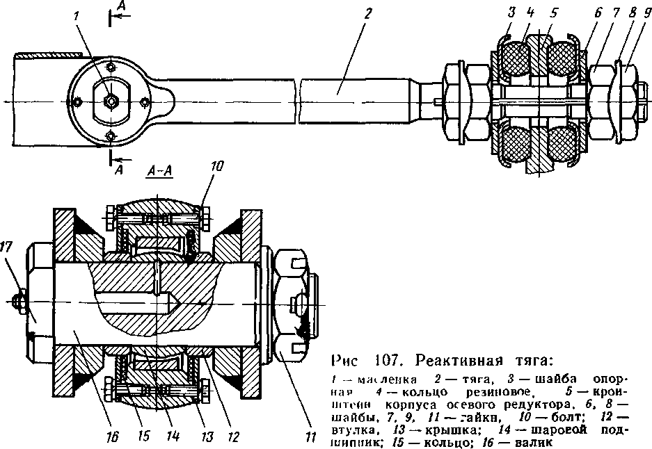Реактивная тяга. На тележке установлены две реактивные тяги (рис. 107), каждая из которых удерживает осевой редуктор от вращения при передаче вращающего момента. Одним концом реактивная тяга через шаровой 'подшипник 14, установленный в ее серьге, крепится к раме тележки; другой ее конец через амортизационные кольца 4 соединен с кронштейном 5 осевого редуктора. Регулировка производится гайкой 7, а стопорится контргайкой 9 и шайбой 8.