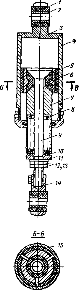Гаситель колебаний (рис. 108) состоит из цилиндра 4 с верхней крышкой 3, в отверстии которой запрессовано резиновое кольцо / со стальной втулкой 2. Внутри цилиндра установлены колодка 5 с фрикционными накладками 15, резиновый элемент 6, шток 9 и клин 7. В полости клина установлена пружина 8, которая